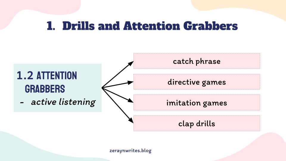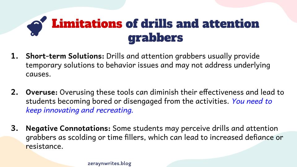 Educators need to understand their students’ characteristics. They should also consider students’ development to provide the most effective classroom management strategies. Drills and attention grabbers can effectively maintain order. They keep students engaged. This ultimately contributes to a seamless and productive classroom routine.